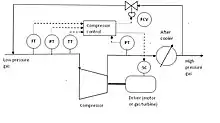 In the oil and gas industry the operation of gas compressors in surge conditions is prevented by instrumentation around the compressor.[15] The measured flow rate of gas (FT) in the compressor suction line together with the suction pressure (PT), and sometimes the suction temperature (TT) and the pressure (PT) in discharge line is fed into the surge controller. Algorithms in the controller use the data to establish the performance of the machine; the data identifies the operating point in terms of the flow and the developed head. When the compressor’s operation approaches the surge point the controller modulates either a flow control valve (FCV) in the recycle line or adjusts the speed (SC) of the compressor driver. The FCV allows cooled gas from the discharge to spill back to the suction of the compressor, thereby maintaining the forward flow of gas through the machine. The recycle line is ideally located to take cooled gas from downstream of the compressor after-cooler and to discharge it into the feed to the compressor suction drum.[16]