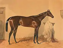 Surplice began his stud career at the Turf Tavern at Doncaster at a fee of 25 guineas.[26] He was not a success as a sire, with his offspring being characterised by R. H. Copperthwaite in his book "The Turf and the Racehorse" as being "tall, leggy, unwieldy and top-heavy".[16] He did however, get the Poule d'Essai des Poulains winner Florin and he was the damsire of the 2000 Guineas winner Prince Charlie.[6] After his death in 1871 at Woodbridge, Suffolk his cannon bones were made into handles for a pair of carving knives.[27]