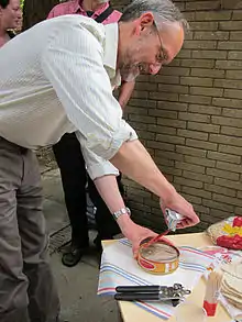 Swedes usually consume surströmming after the third Thursday of August, labeled as "Surströmming day", through early September.[14] Because of the strong smell, it is often eaten outdoors. The pressurized can is usually opened some distance away from the dining table and is often initially punctured while immersed in a bucket of water, or after tapping and angling it upwards at 45 degrees, to prevent escaping gas from spraying brine.