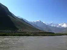 The Suru River is a 185 kilometres (115 mi) long river, that originates from the Panzella glacier which lies at Pensi La pass near the Drang Drung Glacier. The Drang Drung Glacier also gives rise to the Stod River which flows down in the opposite direction from the Suru. The source of the Suru River lies 142 kilometres (88 mi) south of Kargil town, and 79 kilometres (49 mi) north from Zanskar. Srinagar, the capital of Jammu and Kashmir lies 331 kilometres (206 mi) to the west. The Suru River forms the western and northern boundary of the Zanskar Range.[2] The river flows westwards, along with the Kargil-Zanaskar Road, from its source and forms the Suru valley, which is towered by the massif of Nun Kun mountain. It drains the Nun Kun mountain massif of the Zanskar Range in the Suru valley, and is joined by a tributary "Shafat Nala" at the pastures of Gulmatango. This stream originates from the Shafat Glacier.[3] The Suru River then flows northwards through a deep, narrow gorge to Kargil town, where it is fed by the Botkul River which originates from the glacier of the same name.[1] The Dras River, fed by the Shingo River, joins the Suru River at Hardas (also called Kharal), 7 kilometres (4.3 mi) north of Kargil town.[4] The Suru River then enters the Pakistani Administered Kashmir 5 kilometres (3.1 mi) ahead from the point of merger of Dras and Suru rivers through Post 43 and Post 44 of India and Pakistan respectively and merges with the Indus River near Marol.[1][2]