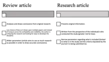 - A research article has more narrow parameters on what is included (often depending on the journal it is being pitched to), whereas a review article is more open, being able to incorporate multiple research papers albeit still being contained within journal guidelines.[18]