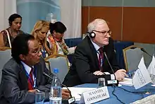 ![]() Goonatilake (left) with an other speaker at World Public Forum "Dialogue of Civilizations" in 2012 | |