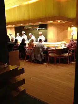 The stark, minimalist restaurant is lined in simple blond-wood, with high ceilings.[11][13][14][15] Sushi Yasuda uses bamboo on its floor, walls, and ceiling.[11][16]