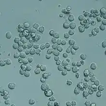 A cell suspension or suspension culture is a type of cell culture in which single cells or small aggregates of cells are allowed to function and multiply in an agitated growth medium, thus forming a suspension. Suspension culture is one of the two classical types of cell culture, the other being adherent culture. The history of suspension cell culture closely aligns with the history of cell culture overall, but differs in maintenance methods and commercial applications. The cells themselves can either be derived from homogenized tissue or from heterogenous cell solutions. Suspension cell culture is commonly used to culture nonadhesive cell lines like hematopoietic cells, plant cells, and insect cells.[1] While some cell lines are cultured in suspension, the majority of commercially available mammalian cell lines are adherent.[2][3] Suspension cell cultures must be agitated to maintain cells in suspension, and may require specialized equipment (e.g. magnetic stir plate, orbital shakers, incubators) and flasks (e.g. culture flasks, spinner flasks, shaker flasks).[4] These cultures need to be maintained with nutrient containing media and cultured in a specific cell density range to avoid cell death.[5]