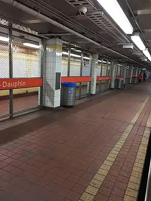 Susquehanna–Dauphin is a subway station on SEPTA's Broad Street Line in Philadelphia, Pennsylvania. The station is located at the 2200 block of North Broad Street in North Philadelphia,[2] between Susquehanna Avenue at the south end and Dauphin Street at the north end.[3] Four tracks travel through the station, however the station is only served by local trains,[2] which travel on the outer two tracks. Along with Cecil B. Moore station, this stop provides access to Temple University, which is located one block south of Susquehanna Avenue.[4] Service began at the station, formerly known as Dauphin–Susquehanna, on September 1, 1928, as part of the original segment of the Broad Street Line, which ran from City Hall station to Olney station.[5]