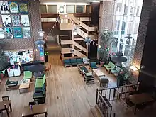 Today the campus is self-contained, with facilities including eights cafes/restaurants, a post office, a Co-op Food store, a market, a bank, a pharmacy, a health centre (including a dentist) and childcare facilities.[35] Spence's designs were appreciated by architects; many of the campus buildings won awards. A number of features define these buildings, including the materials used and the fact that many of them have planted and tree-filled courtyards. The gatehouse-inspired Falmer House won a bronze medal from the Royal Institute of British Architects.[5] Another campus building, The Meeting House, won the Civic Trust award in 1969.[36] In 1993, the buildings which made up the core of Spence's designs were given listed building status, with Falmer House being one of only two buildings to be given a Grade 1 status of "exceptional interest".[36] A number of the original buildings are now Grade I listed buildings, the first time university buildings in England become listed.[37]