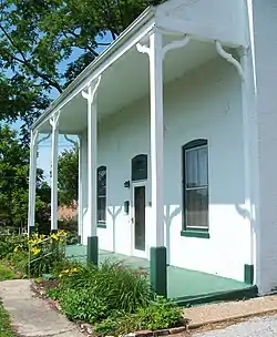 The house as a 1½ story main block, three bays wide and one deep, with a 1-story wing to the rear and a later 2-car garage attached to the northwest corner. All portions of the house are of brick, painted white. The windows are tall and narrow, 2 over 2 double-hung, with segmental arched heads. Across the east front of the main block is a verandah, whose roof is supported by shaped slat-like brackets and square posts on square pedestals. The floor of the verandah is now concrete. Twin chimneys pierce the rear slope of the main roof, they have elaborately corbelled tops. Original woodwork remains throughout the interior, including shaped lintels over doors and windows, and a fireplace in the south room. The staircase ascends away from the front door and turns into the north room; it once had a second flight into the kitchen. Basement stairs descend from the back porch, which was enclosed in 1951. The kitchen has been modernized.[3]