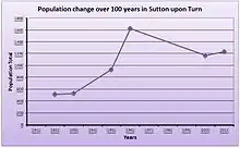The first census entry for Sutton upon Tern was made in 1921 where it had a total population of 512. This figure began to grow and by 1961 the population had tripled in size to 1,622 people.[15] This can be attributed to the introduction of the National Health Service in 1948 allowing widespread use of new antibiotics and the post-war National Food Policy.[16] All contributing to the post war baby boom. The population total has since peaked and has been slowly declining as shown in the most recent census of 2011.[17]