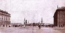 By the late eighteenth century, the plot of land to the west of the Saltykov Mansion was owned by Alexander Vorontsov. Vorontsov passed on the land and it became a garden for the Saltykov Mansion, stretching between the mansion and the Marble Palace, and separating the Tsaritsa Meadow from the bank of the Neva.[3] In 1818, the garden was bought by the treasury and redeveloped into a square to the designs of architect Carlo Rossi.[3] Mikhail Kozlovsky's monument to Alexander Suvorov was moved to the centre of the new square, and from 1823, it became known as Suvorov Square.[3] Rossi reworked the facade of the Saltykov Mansion facing the square, adding new window openings to the previously blank walls, and creating a porch entrance onto the square.[2] He also continued Sadovaya Street alongside the Field of Mars, connecting it with Millionnaya Street at the square.[2] From 1824, a pontoon bridge across the Neva linked Suvorov Square with Trinity Square, becoming known as Trinity Bridge.[3] The pontoon design was replaced by a permanent structure in 1903. During the winters from 1895 to 1910, a tramway was laid across the ice of the Neva from the square towards the Vyborg side of the river, and later to the Petersburg side.[1]