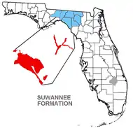 Suwannee Limestone is found in the peninsula carbonate outcroppings on the northwestern, northeastern and southwestern flanks of the Ocala Platform. However, Suwannee Limestone is not present on an area known as Orange Island on the eastern side of the Ocala Platform due to erosion, nondeposition or both.[1] This limestone is present in southeastern Leon, Jefferson, Madison, Taylor, Lafayette counties as well as Hamilton along the upper Suwannee River basin, and southward into Suwannee County, Florida.