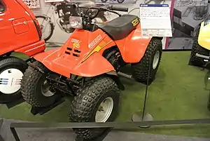 The Suzuki LT125 Quadrunner (also known as the Suzuki QuadRunner 125[1]) was an all-terrain vehicle produced by Suzuki and developed in Whanganui, New Zealand by Rod Coleman. When it was introduced alongside the ALT125 ATC in 1982, it was the first four-wheeled ATV on the market.[2] It had a pull start (no electric starter at all) 124 cc (7.57 cu in) engine, which had a claimed power output of 8.3 kW (11.1 hp) at 7,000 RPM.[3] The power was transmitted to the wheels via a 5-speed semi-automatic transmission with reverse.[4] Braking was accomplished via a single drum brake on the rear axle, with no front brakes. The LT125 also had no suspension front or rear, with all bump handling being accomplished by its low pressure tires.