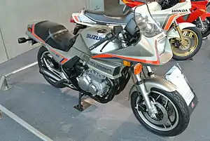 The Suzuki XN85, released in early 1983, was a turbocharged motorcycle designed as a sports bike. The name came from the claim that it produced 85 bhp, although rear wheel measurements were in the low 70s. It featured the first factory 16-inch front wheel (at least in the U.S.), previously seen only on race bikes. It also had low clip-on handlebars, rearset foot pegs, four-into-one exhaust, electronic fuel injection, and a monoshock rear suspension called the Suzuki Full Floater—the first to feature this. Its styling was derived from the Suzuki Katana.[3]