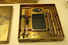 Suzuri-bako (硯箱; "inkstone box") are a type of Japanese writing box. The boxes are traditionally made of lacquered wood and are used to hold writing implements.[1] Historically, the boxes were associated with calligraphy, and as such they were made using high-quality materials designed to safeguard porcelain inkstones (suzuri) from damage.[2]