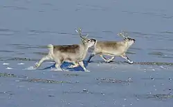 The Svalbard reindeer (Rangifer tarandus platyrhynchus) is a small subspecies or species of reindeer found on the Svalbard archipelago of Norway. Males average 65–90 kg (143-198 lb) in weight, females 53–70 kg (116-154 lb),[2] while for other reindeer generally body mass is 159–182 kg (350-400 lb) for males and 80–120 kg (176-264 lb) for females.[3]
