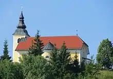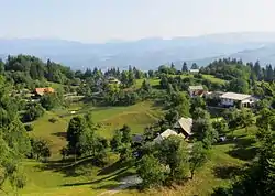 The local church is dedicated to Saint Nicholas and belongs to the Parish of Moravče. It dates to the mid-15th century.[8] Saint Nicholas was the patron of boatmen on the Sava River. The church was referred to as the "Guardian of the Upper Sava" (Slovene: čuvar zgornje Save) because the boatmen believed that they were protected as long as they had the church in their sight. The church is vaulted, with a rectangular nave and a shallow chancel. Tradition states that the church was built to replace an older church that stood in Velika Vas but was burned by Ottoman forces. A less accessible location was selected for the new church, at a site where a pagan temple formerly stood.[9] The remains of a fortified wall surround the church, and the building has frescoes dating from the 15th and 16th centuries that have been whitewashed over. The main altar features a painting by Franz Götzl and the side altars have Baroque paintings.[4]
