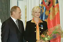 In July 2005, Khorkina gave birth to a son, Svyatoslav Khorkin, at Cedars-Sinai Medical Center in Los Angeles, United States but refused to name the father of the child. The father was later revealed to be businessman Kirill Shubsky, who was married to actress and film director Vera Glagoleva.[40] In April 2011, Khorkina married Oleg Kochnev. He is a former general in Russia's Federal Security Service and 23 years her senior. Khorkina and Kochnev have a son, Ivan, born in October 2019.[40]