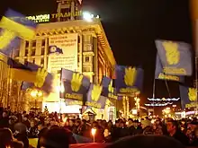 However, according to Polish lawyer and political scientist Tadeusz A. Olszański, Tyahnybok never concealed that these changes were made primarily for image purposes.[41] The party remained associated with the 'wide social nationalist movement' (consisting of numerous organisations and websites) and gathered around the Social-Nationalist Assembly which was set up in 2008. Yuri Mykhailyshyn, Tyahnybok's adviser who topped the list of Svoboda's Lviv branch in the 2010 municipal council elections, founded the Internet Joseph Goebbels Political Research Centre (the centre later changed Goebbels for Ernst Jünger) in 2005. Patriot of Ukraine, a paramilitary organisation dissolved in 2004 and re-established in 2005 in a different legal form, continued to maintain ties with Svoboda. It was not until 2007 that this paramilitary organisation announced the end of its relationship with Svoboda.[42] Even then, some prominent Svoboda members, such as Andriy Illienko from Svoboda's Kyiv branch, continued to identify themselves with the ideas of Patriot of Ukraine, which still uses the Wolfsangel symbol.[41]