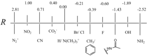 where i is an intercept to keep from fixing the origin at (0,0). If this was not done, the equation would give exceedingly more weight to the unsubstituted compounds that one is trying to make a comparison to using this equation.[1] A linear least-squares analysis is used to determine the coefficients/constants a, b, and i (Swain and Lupton used a procedure called DOVE: Dual Obligate Vector Evaluation).[2] Constants were first based on three previous reactions (σm, σp, σp+), which leads to more possible errors since the compiled data is only a minimal combination of a much larger pool. Seeing possible error in this limited pool, the data pool was increased by assigning a scale to begin with. A zero-scale is used for hydrogen, because it is known to neither readily donate or accept electron density when attached to a carbon atom due to similar electronegativities. A value of 1 was assigned to NO2, because previous research determined the effect of this substituent was predominantly due to resonance.[3] Lastly, F was set equal to R for both components so that the field effects could be compared directly to the resonance effects. This then leads to: