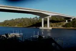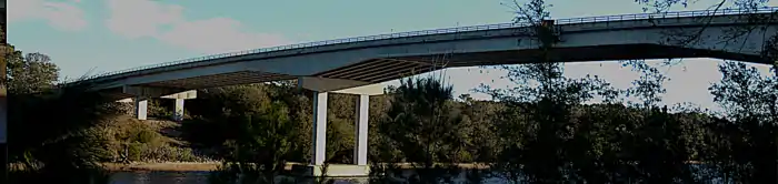 The 980-foot-long (300 m), 80-foot-wide (24 m) deck structure, consists of prestressed concrete girders which carry four traffic lanes across the ICW at 65’ above Mean High Water.[2] The bridge has for the most part been accident free with the notable exception of a construction related incident in December 2008 when a concrete girder placed on a pier dislodged before it was property secured, fell to the ground and killed one worker.[3] The National Bridge Inventory for 2017 listed the bridge condition as good.[4]