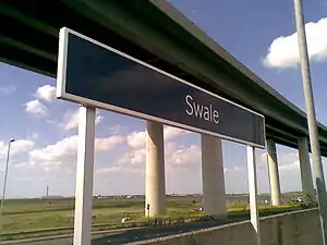 Swale is a single platform station with one curving platform. It is immediately adjacent to the A249 road which is on a flyover above the station before it crosses The Swale on the Sheppey Crossing. The station is named after The Swale, the channel which separates the Isle of Sheppey from the mainland and connects with the River Medway to the west and Thames Estuary to the west. North of the station, the railway line crosses the channel on the Kingsferry Bridge. Ridham Dock lies 1 mile (1.6 km) south-east of the station.