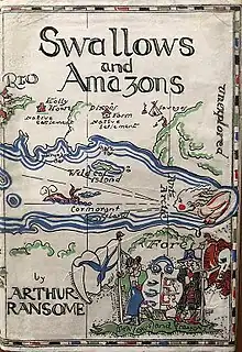 Swallows and Amazons is a children's adventure novel by English author Arthur Ransome and first published on 21 July 1930 by Jonathan Cape.[1] Set in the summer of 1929 in the Lake District, the book introduces the main characters of John, Susan, Titty and Roger Walker (Swallows); as well as their mother, Mary; and their baby sister, Bridget (nicknamed Vicky). We also meet Nancy and Peggy Blackett (Amazons); their uncle Jim (James Turner), commonly referred to as Captain Flint; and their widowed mother, Molly Blackett. It is the first book in the Swallows and Amazons series, followed by Swallowdale.