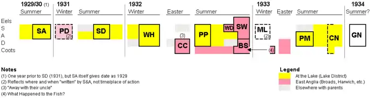 The following diagram shows the implied timeline of the books in the series. The initials indicate an acronym for the title of each book, e.g. SA is Swallows and Amazons; PD is Peter Duck, and so on.