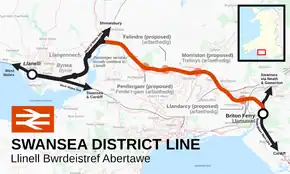 The Swansea District line (Welsh: Llinell Bwrdeistref Abertawe) is a section of railway line running through the northern part of Swansea, Wales and is primarily used for freight transportation, although minimal passenger services also traverse the route. It was built by the Great Western Railway in 1912 to provide a faster and less steeply graded route between London and Fishguard, in connection with the recently opened harbour at the latter place. It can thereby claim to be the last mainline railway to have been built in Wales. The double track line runs from Cwrt Sart junction at Briton Ferry on the South Wales Main Line to Morlais junction near Pontarddulais on the Heart of Wales line.