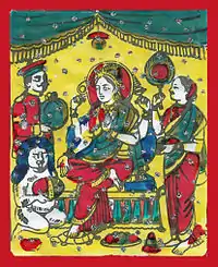 The painting of Goddess Lakshmi in Newar tradition is distinguished by her accessories and attendants. She is shown holding a Jwālā Nhāykan (ज्वाला न्हायकं) (mirror encircled by flames) in her right hand and a Sinhamu (सिन्ह:मू) (powder container covered by a five-tiered parasol) in the left hand. These two ritual objects stand for prosperity and good fortune and are necessary for many ceremonies in Newar society.
