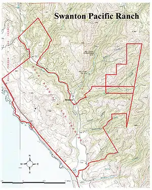 Swanton Pacific Ranch sits in the coastal mountains north of Santa Cruz. The 3,200-acre (1,300 ha) spread include 2,100 acres (850 ha) of forest extending from steep mountain slopes down to grassy meadows. Scott Creek runs through Swanton Ranch. "The landscape is different here than on campus," notes natural resource management Professor Brian Dietterick, a certified hydrologist and the ranch's director. "First are coastal forested mountains- steep mountains that support perennially flowing streams. The streams serve as habitat for sensitive aquatic species and fish like Coho salmon and Steelhead trout." Swanton Pacific is a unique place to teach resource management. "It's similar to a Northern California Forest," he states. Swanton Pacific is a living forest laboratory unlike any other at Cal Poly's 1,300-acre (530 ha) campus core or the 4,600 acres (1,900 ha) of university ranches just west of the campus.[3] Swanton Ranch overlooks the Pacific Ocean. It lies fifteen miles (24 km) north of Santa Cruz. The elevation ranges from sea level to around 1,200 feet (370 m) on the highest ridge north of Little Creek. There are four ecological regions on the land: cropland, forest, rangeland and riparian land. Riparian lands are adjacent to water sources. There are riparian corridors along Scotts Creek, Mill Creek, Little Creek, Archibald Creek, Queseria Creek, and some smaller unnamed drainages. The riparian corridors provide a habitat for both the endangered Central California Coast evolutionary significant unit of coho salmon and the threatened Central California Coast distinct population segment of steelhead.[4]