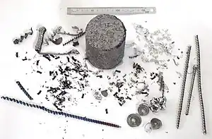 Swarf, also known as chips or by other process-specific names (such as turnings, filings, or shavings), are pieces of metal, wood, or plastic that are the debris or waste resulting from machining, woodworking, or similar subtractive (material-removing) manufacturing processes. Swarf can be small particles (such as the gritty swarf from grinding metal or the sawdust from sawing or sanding wood); long, stringy tendrils (such as the springy chips from turning tough metals, or long shavings from whittling); slag-like waste (such as is produced within pipe during pipefitting work); or stone fragments and dust (as in masonry).[1]