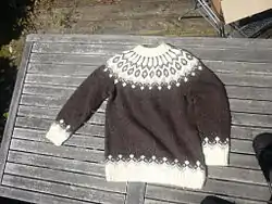 A knitted garment worn on the upper body, typically with long sleeves, put on over the head.