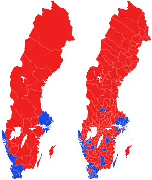 The Alliance received 49.27 percent of the votes (an increase by 1.03 pp from the previous election) and 173 seats in the parliament (a decrease by 5 seats and 2 short of an overall majority), while the Red-Greens received 43.60 percent of the vote (a decrease by 2.48 pp) and 156 seats (a decrease by 15 seats).[1] The election also saw the nationalist Sweden Democrats entering parliament for the first time, as the sixth largest and only non-aligned of the eight parties elected to the parliament, by receiving 5.70 percent of the votes (an increase by 2.77 pp) and 20 seats.[1] Both in terms of percentage share; 30.06%, and the actual vote; 1,791,766, the Moderate Party had its strongest election of the unicameral parliamentary era, narrowly missing out on beating the Social Democrats to become the largest party.[2] The Alliance dominated the Stockholm capital region of the municipality and county and made further gains in South Sweden including narrowly flipping Malmö blue as well as winning pluralities in traditionally red towns such as Kalmar, Landskrona and Trelleborg.[1]