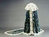 Eric XIV's coronation robe is the oldest garment that has been kept from a Swedish coronation. It is a velvet robe in a deep purple colour. Originally the robe was decorated with 455 golden crowns. The crowns are embroidered with golden, white, blue and pink silk, and on each crown ten small pearls were attached. Today only 296 of the crowns remain.[2] When king Eric was crowned the robe also had a trimming and a collar made out of ermine. After Eric XIV, John III, Charles IX and Gustav II Adolf have used the robe during their coronations.[3]