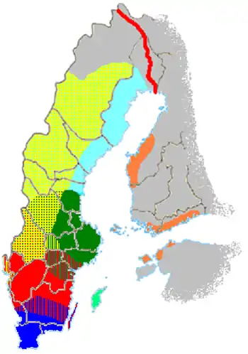 - Götaland dialects (red); (Västergötland, Korsberga socken, Vartofta härad, Skaraborgs län).