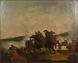 Almost an hour later,[80] in the early afternoon, Görtz stumbled upon the Swiss battalion in full march near Gießübel (Schleusegrund). He launched a mounted attack through the forest without success. The Swiss established a solid defence, forcing the Swedes to dismount their horses to attack. They advanced in the cover of the trees but were initially unable to dislodge the enemy. A request to surrender by Görtz was likewise refused.[81] He then sent Ryttmästare Törnflycht to attack their rear,[82] and prepared cavalry in the front.[78] After an hour of fighting,[83] the Swiss, attacked from all sides and with their commanding-officer wounded, threw down their arms and fled.[lower-alpha 12][82] Darkness prevented Görtz from pursuing much further.[84] He sent orders for Adlerberg to rendezvous with him at Ilmenau.[85] The Saxon army broke up into companies,[76] with some retreating towards Franconia, others towards Coburg and Bayreuth, while the battered Russians fled towards the Bohemian Forest. Most of their baggage was abandoned.[86]