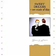 "Sweet Dreams (Are Made of This)" is a song by British new wave music duo Eurythmics. It is the title track of their album of the same name (1983) and was released as the fourth and final single from the album in early 1983. The song became their breakthrough hit, establishing the duo worldwide. It reached number two on the UK Singles Chart in March 1983 and number one on the US Billboard Hot 100 six months later; it was their first single released in the US.