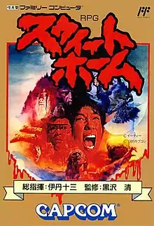 Sweet Home[lower-alpha 1] is a role-playing video game developed and published by Capcom for the Family Computer in 1989. It is based on the Japanese horror film of the same name and tells the story of a team of five filmmakers exploring an old mansion in search of precious frescos hidden there. As they explore the mysterious mansion, they encounter hostile ghosts and other supernatural enemies. The player must navigate the intricately laid out mansion, battling with the enemies, and the five main characters with the limited weapons and health restorative items available. The narrative moves forward regardless of whether the characters stay alive, and leads to its five different endings.