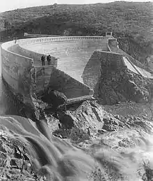 The Sweetwater River rose until it reached a peak flow of 45,500 cubic feet per second (1,290 m3/s) on January 30, 1916 and though the dam had been increased in height and its spillway capacity enlarged, this did little to prevent it from overflowing. The reservoir overtopped the dam crest by an estimated 3.5 feet (1.1 m) in an event similar to, but far larger than 1895. The river breached the north abutment of the dam, then soon after the south end just left of the spillway went with it. Like in 1895, the main structure of the dam was not heavily damaged but the river eroded enough material around the structure[20] to allow two-thirds of the reservoir to drain. The failure of the dam caused extensive damage downstream, including the destruction of over 15,000 ft (4,572 m) of Sweetwater Water Co. pipeline, all railway track and electric utility lines.[21] The dam was subsequently rebuilt and an additional spillway added to pass future floods.[4][22]