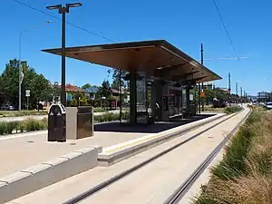 Swinden Street is a light rail station in Australia on the Canberra Metro R1 Civic to Gungahlin line, located on Northbourne Avenue at the intersection of Swinden Street, opposite the Lyneham sports complex. The station serves the suburbs of Lyneham and Downer, with a small dedicated park and ride that opened in December 2020.[1] Bicycle racks are also provided for commuters adjacent to the station.[2]