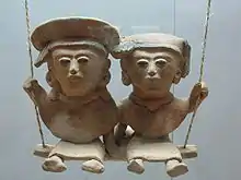 The earliest known representations of swings come from artifacts found in Greece. A terracotta sculpture of a woman sitting on a swing was found at Hagia Triada dated to the Late New Palace period (1450–1300 BC).[3]