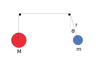Specifically, it comprises two masses (the pendulum, mass m and counterweight, mass M) connected by an inextensible, massless string suspended on two frictionless pulleys of zero radius such that the pendulum can swing freely around its pulley without colliding with the counterweight.[1]