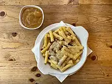 Rösti is a kind of fried potato cake served as a main course or side dish. As a main dish, rösti is usually accompanied with cheese, onions and cold meat or eggs. This dish, originally from Zurich, was first simply made by frying grated raw potatoes in a pan. It has then spread towards Bern where it is made with boiled potatoes instead. This is where it took the name Rösti.[20] There are many variants in Switzerland and outside the borders.[21] This culinary specialty gives its name to the röstigraben, which designates the cultural differences between the German and French speaking parts of the country.