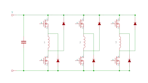 The phases in an asymmetric bridge converter correspond to the motor phases. If both of the power switches on either side of the phase are turned on, then that corresponding phase is actuated. Once the current has risen above the set value, the switch turns off. The energy now stored within the winding maintains the current in the same direction, the so-called back EMF (BEMF). This BEMF is fed back through the diodes to the capacitor for re-use, thus improving efficiency.[12]