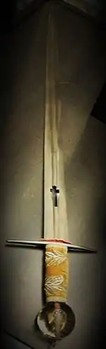 The sword was first mentioned in 1333 in the articles of inventory of the Treasury of the St. Vitus Cathedral. It is not clear when the sword was first used during coronations but in the Coronation Ordo written by Charles IV (maybe in 1347), the sword already had its ceremonial role.[1] The sword was carried by the supreme marshal of the Bohemian Kingdom in front of the king alongside the other crown jewels in the ceremonial procession to the main altar of Prague Cathedral.[2] Before the king was crowned, he was given the blessed sword for a while and after the coronation itself, the sword was used for the purpose of granting knighthoods at the end of the coronation Mass.