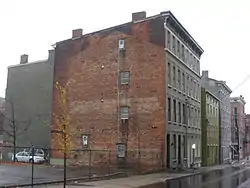 The Sycamore-13th Street Grouping is a cluster of historic buildings in the Over-the-Rhine neighborhood of Cincinnati, Ohio, United States. Built during the middle and later years of the nineteenth century,[2] these eighteen buildings are built of brick and sandstone with elements of stone and iron.[3] Some of the buildings feature elements of the Greek Revival, Italianate, or Queen Anne styles of architecture,[1] but the majority of the buildings in the cluster are simple vernacular structures. Virtually all of the buildings in the grouping were constructed for residential purposes, although some were built exclusively as apartment buildings, while some originally had both residential and commercial space. The structures built as commercial-and-residential buildings are those most likely to feature defined architectural styles, rather than vernacular designs.[2]