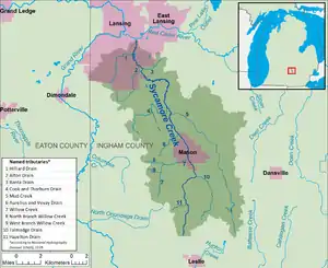 Sycamore Creek is a tributary of the Red Cedar River in the state of Michigan in the United States. The stream is 26.5 miles (42.6 km) long[4] and drains an area of 106.1 square miles (275 km2)[5] on the central Lower Peninsula, in and around the city of Lansing. Via the Red Cedar River, it is part of the watershed of the Grand River, which flows to Lake Michigan. Via Lake Michigan and the Great Lakes system, it is part of the larger watershed of the St. Lawrence River.