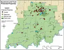Since its founding in 1990, Sycamore has protected more than 9,000 acres of land on 100 parcels. Sycamore protects land by owning nature preserves, and by holding permanent conservation easements on privately owned land. Properties span fifteen Indiana counties, including Bartholomew, Brown, Crawford, Gibson, Greene, Harrison, Knox, Lawrence, Martin, Monroe, Morgan, Orange, Owen, Pike, and Vanderburgh Counties.[1] Many of the properties that Sycamore owns outright have hiking trails and are open to the general public.