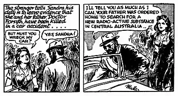 Miller relinquished the job of drawing the Chesty Bond comic-strip in mid-1945 in order to work on the serialised Sandra strip. His 'Sandra' character first appeared in Melbourne's The Herald newspaper in an "adventure mystery" comic-strip titled Sandra: Murder in Studio 3, published daily (except Sundays) from late-July 1945.[56] Sandra also began to be syndicated in Hobart's The Mercury and Adelaide's The News in July 1945 and Perth's Daily News in September 1945.[76] 'Murder in Studio 3' concluded in The Herald in Melbourne in early November 1945, with a new Sandra episode starting on the following issue.[77] The new episode, which also began to be serialised in Brisbane's Courier-Mail newspaper soon afterwards, had a specific Australian setting (rather than the generic noir feel of 'Murder in Studio 3'). Sandra was revealed to be the daughter of the scientist Dr. Forsyth, with the storyline based upon "a race to develop atomic power".[78][79] Sandra was published in The Herald until early November 1946, when the comic-strip concluded (to be replaced by Miller's Rod Craig).[80]