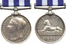 In January 1881, Eardley-Wilmot was promoted to commander and transferred to the Admiralty for three years until May 1884 when he took command of HMS Dolphin, a composite sloop, in the Mediterranean where the ship took part in military operations in eastern Sudan in 1884–1885. He was at Suakin and took part in defending attacks on the camp there. He took part in the blockade of the coast of Greece. He received the Egypt Medal (second version) with Suakin clasp and the accompanying Khedive's Bronze Star.[1] At an unknown date he received the Order of Osmanieh, fourth class, of the Ottoman Empire.[3]