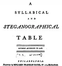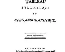 Syllabical and Steganographical Table (French: Tableau syllabique et stéganographique) is an eighteenth-century cryptographical work by P. R. Wouves. Published by Benjamin Franklin Bache in 1797, it provided a method for representing pairs of letters by numbers. It may have been the first chart for cryptographic purposes to have been printed in the United States.[1][2]